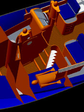 To your left are the crew bunks, one full size, one 3/4 size for children or a small adult. Mattresses are of 4" foam laminate and covered in the fabric of your choice. Beneath the crew bunk is a storage compartment.
